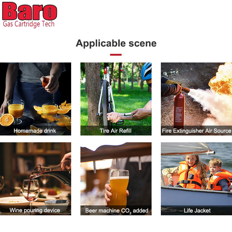 CO2-kaasupatruunoita käytetään laajalti eri teollisuudenaloilla, mukaan lukien ruoka ja juoma, renkaiden täyttö, pelastusliivit ja sammuttimet. Kauneussovelluksissa käytetään 33 grammaa CO2-kaasua ihon viilentämiseen ja tulehduksen vähentämiseen.