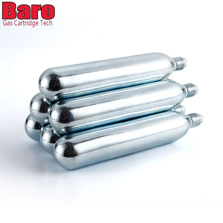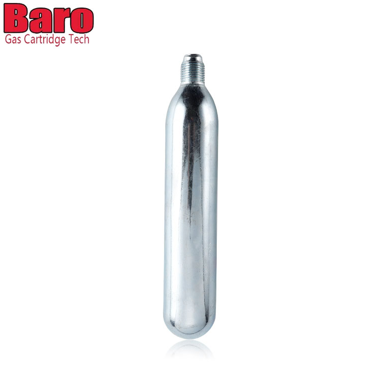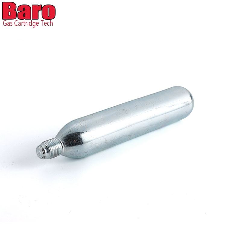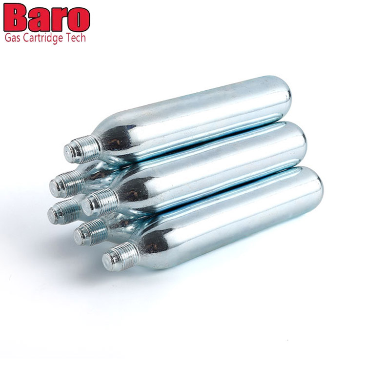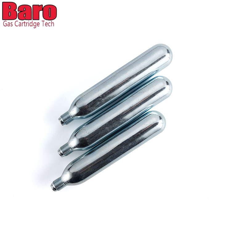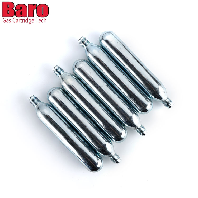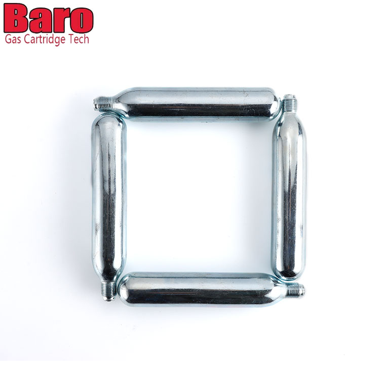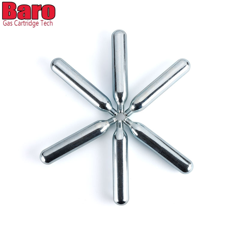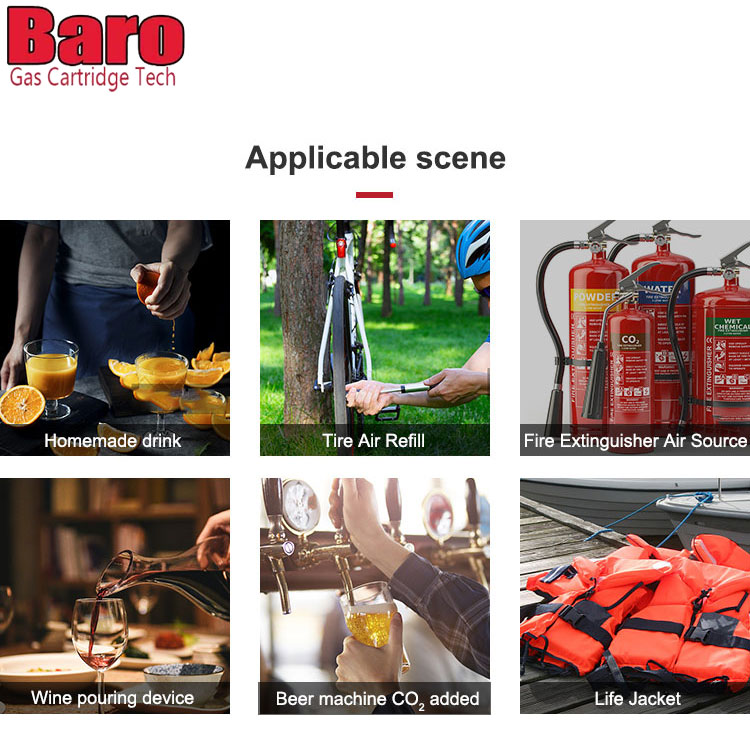 Baro CO2 -patruunoita voidaan käyttää erilaisissa laitteissa - viinikarbonaattoreista polkupyörän renkaiden täyttöihin. Tavallinen valkoinen laatikko, jossa ei ole logoa, turvallisuustiedot. Turvallisuustiedot on painettu kasettiin.